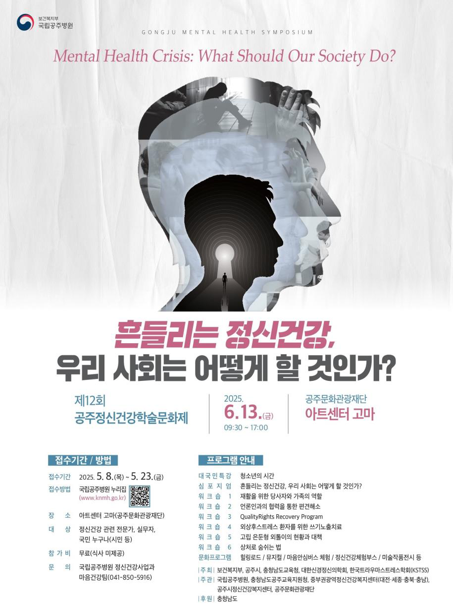 이종국 국립공주병원장은 “이번 정신건강학술문화제에서는 오늘날 정신건강의 위기 속에서 우리 사회가 회복을 위해 어떻게 해야 하는지 같이 고민하고, 이야기 나누며 희망을 찾아보려고 한다”라며, “이를 위해 다양한 학술프로그램 및 문화예술 프로그램들이 준비되어 있으니 많은 참석 부탁드린다”라고 말했다.